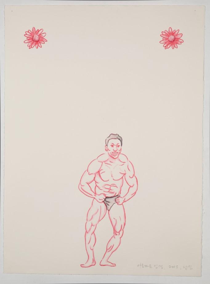남성으로서 젊음에 대한 욕망이 과도한 운동과 근육질 몸에 대한 집착으로 드러나는 현상을 해학적인 드로잉으로 표현했다.