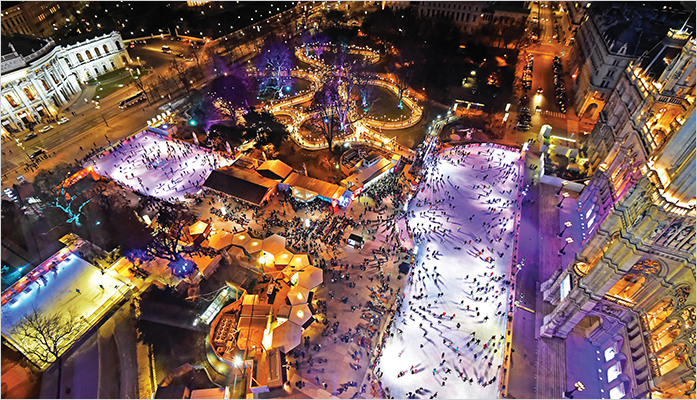 오스트리아 빈 시청 광장에 펼쳐진 ‘빈 아이스 드림’은 비엔나의 겨울을 알리는 얼굴이다. 이 아이스링크의 특징은 시청 앞에 조성한 라타우스 공원의 산책로를 아이스링크장으로 향하는 길로 만들어 숲길을 산책하듯 입장할 수 있다는 점이다. 스케이트를 타고 굽이굽이 이어진 얼음길을 달리면 아름다운 조명으로 불을 밝힌 아이스링크장이 나타난다.