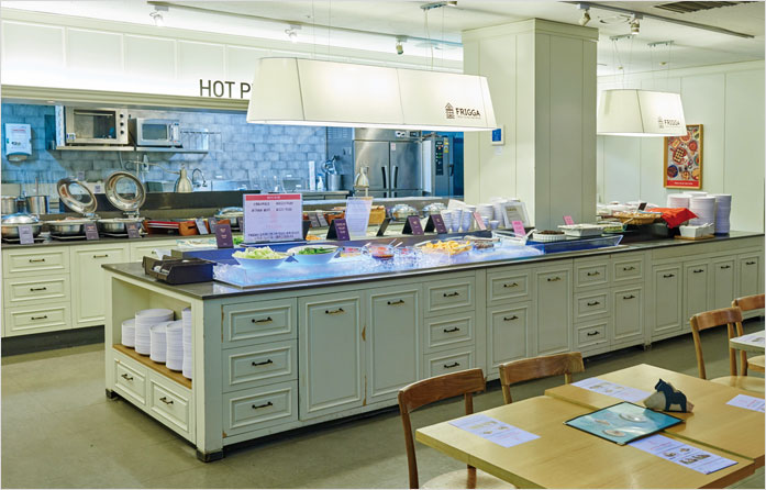 다른 뷔페와 달리 메인 메뉴가 있다는 것이 가장 큰 특징. 해물토마토 파스타, 베이컨 크림 파스타, 비빔밥, 뚝배기 불고기 가운데 원하는 메뉴를 선택한 후 메인 메뉴와 샐러드바를 함께 즐기는 방식이다. 그리 크지 않은 뷔페지만 메인 메뉴 맛도 뛰어날뿐더러 훈제 연어, 샌드위치, 케이크 등을 맛볼 수 있는 샐러드바까지 갖춰져 있다. 한편, 커피 머신과 함께 일회용 컵이 준비되어 있어 커피를 테이크아웃 할 수 있다.