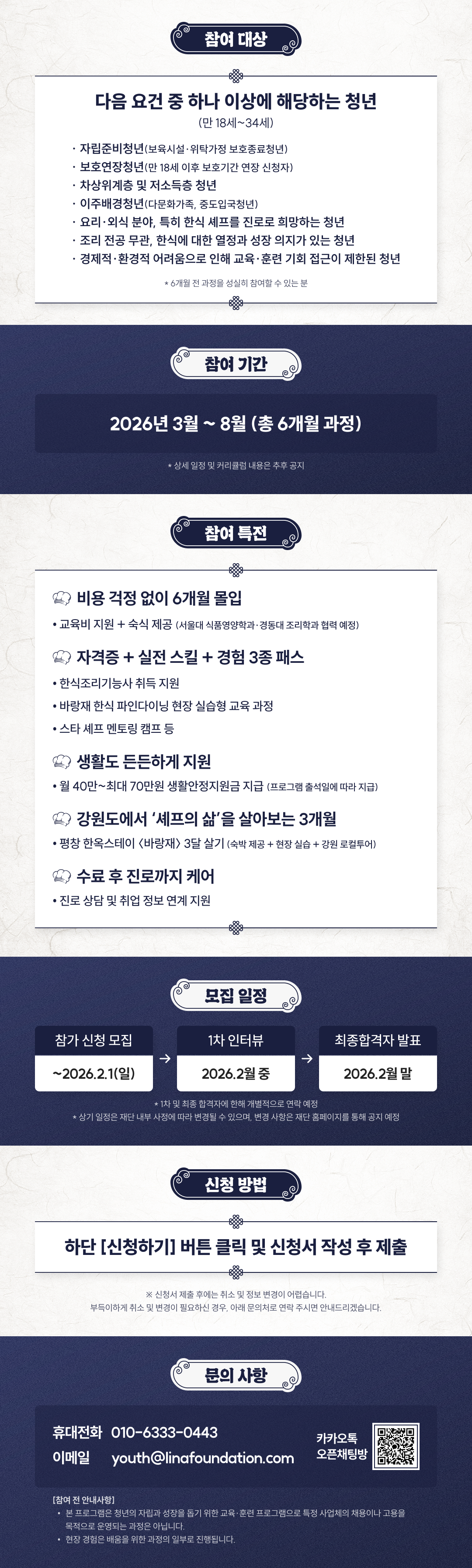 자격증 이론부터 실전 교육 그리고 한식 파인 다이닝 현장에서 직접 배우며 성장할 수 있는 인큐베이팅 프로그램으로, 6개월의 프로젝트 기간 동안 교육비 지원 및 숙식 제공 그리고 생활안정지원금과 수료 후